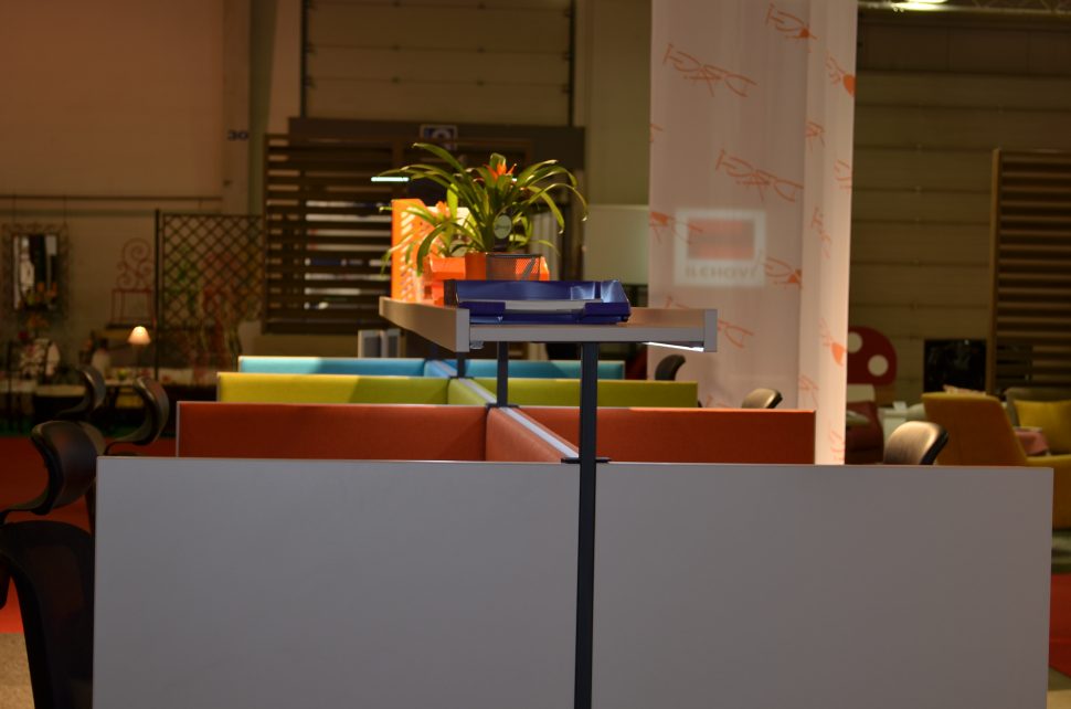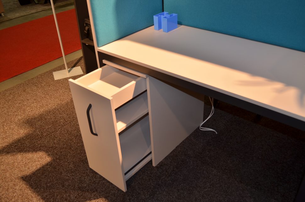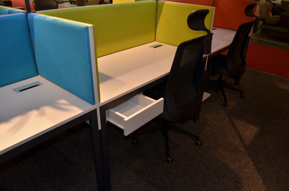 Изключително актуални към момента бюра с шумоизолиращи, тапицирани прегради. Подходящи за отворени офиси, тип кол център. Представихме ги с допълнителни модули за удобство при работа – вертикален контейнер, чекмедже, стойка за компютър и кабелоотводи. Нещо ново и интересно е надстройката с осветление, която създава още по-приятна атмосфера.