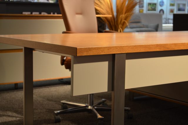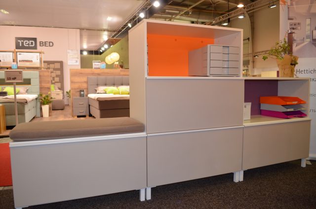 Desk and cabinets, made of chipboard and metal. The main colours – white and cashmere, colour accents are the back of the cabinets and the upholstered devider. Unique for this furniture is the cable organizer under the worktop, as well as the comfortable metal handles of the drawers.