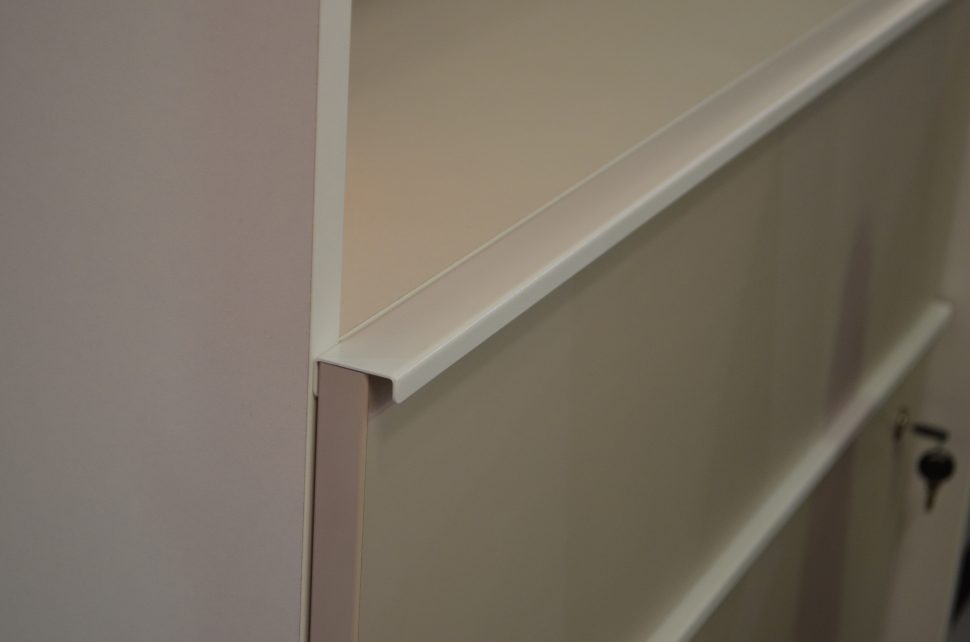 Desk and cabinets, made of chipboard and metal. The main colours – white and cashmere, colour accents are the back of the cabinets and the upholstered devider. Unique for this furniture is the cable organizer under the worktop, as well as the comfortable metal handles of the drawers.