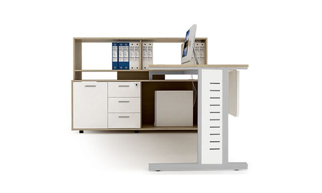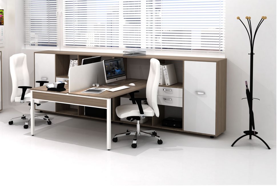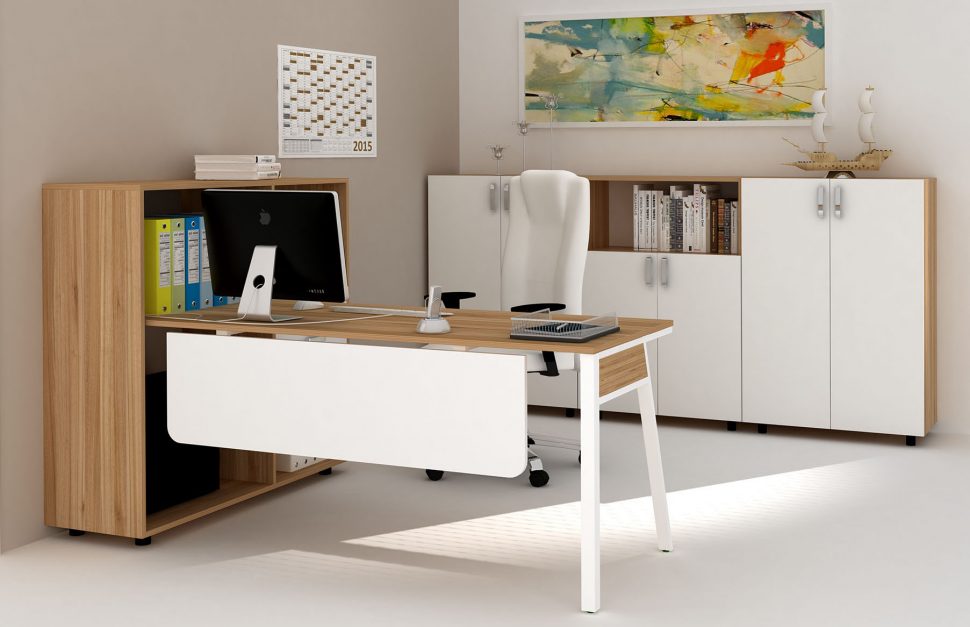 The desks can be combined with various accessories and additional modules – a front panel, a computer stand, a pedestal with a drawers, cupboards and more.