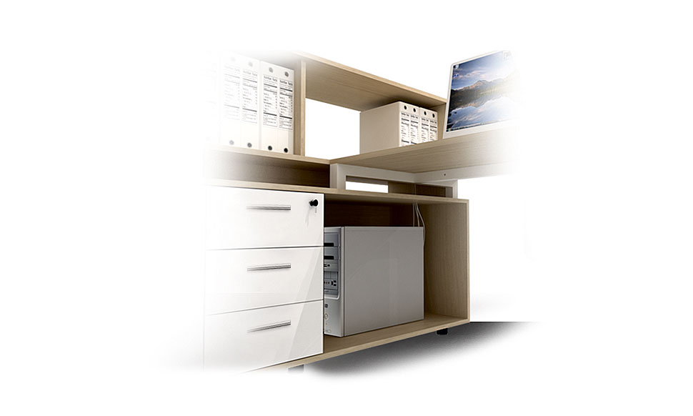 We offer different models of auxiliary cupboards, several models of legs for a desks and a variety of colors for the countertop. So anyone can create their own individual and functional working place.