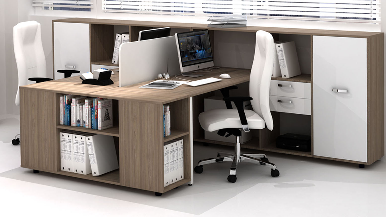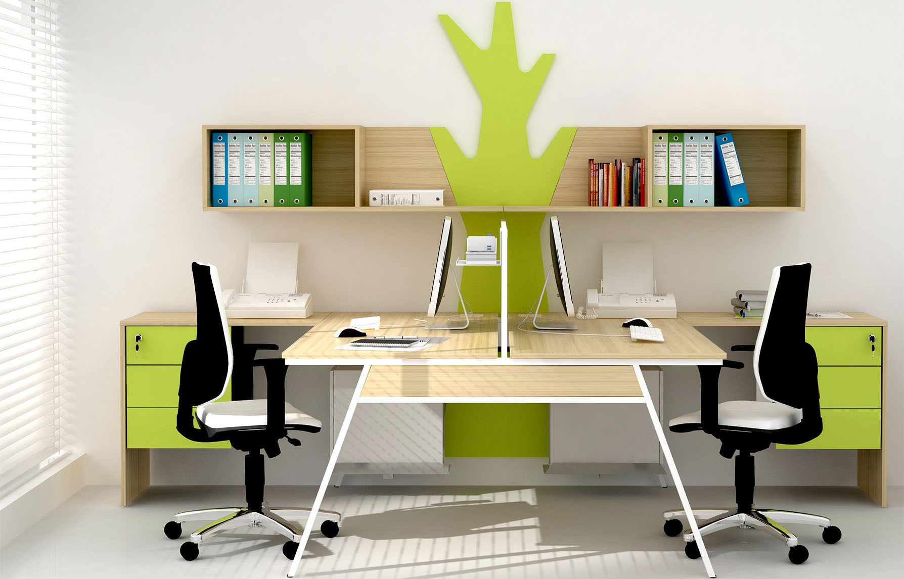 Desks, combined for two people, mounted to the cupboards, optimize office space and create convenience for the employees.