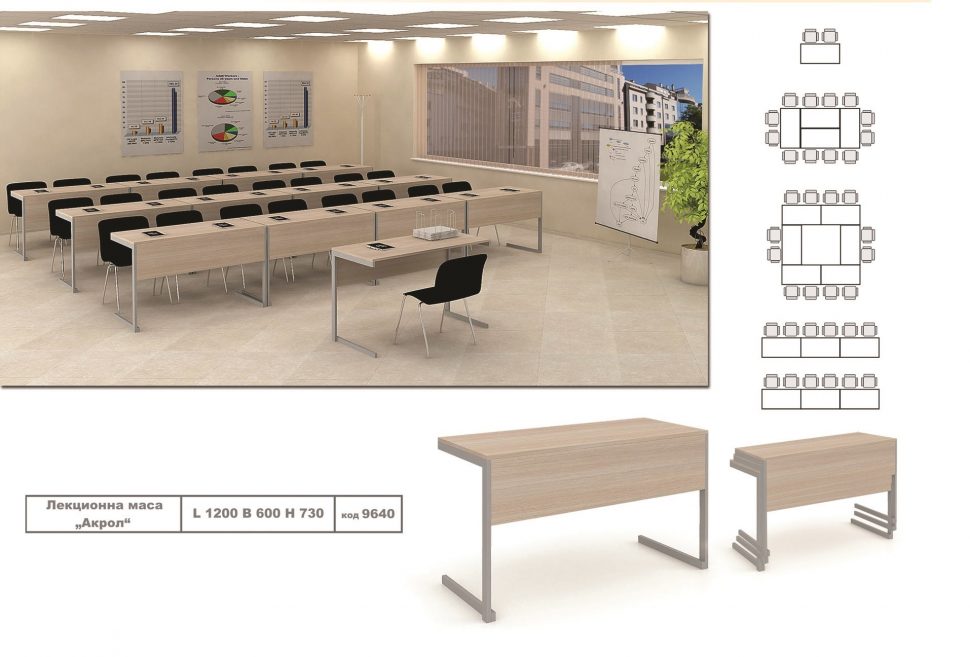 So constructed, the Lecture Tables “Akrol” are very robust, reliable and practical. The "П" shaped leg creates convenience in arranging the tables next to each other. It is possible to place more chairs without the legs of the table interfering of the seated employee. They can easily be arranged in different combinations according to the needs and size of the room.