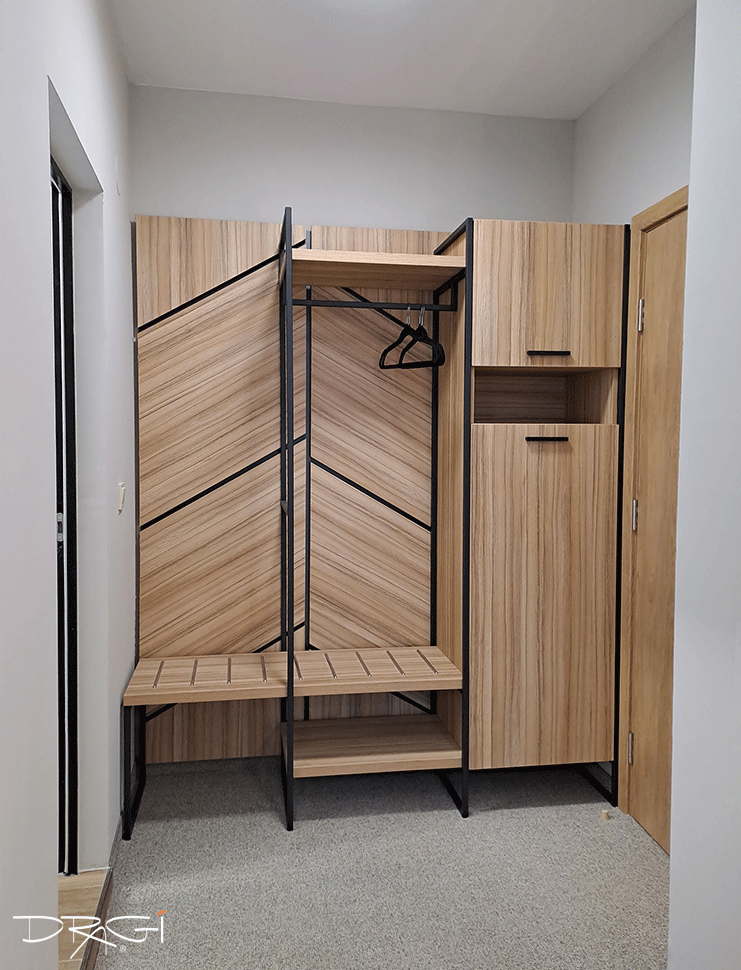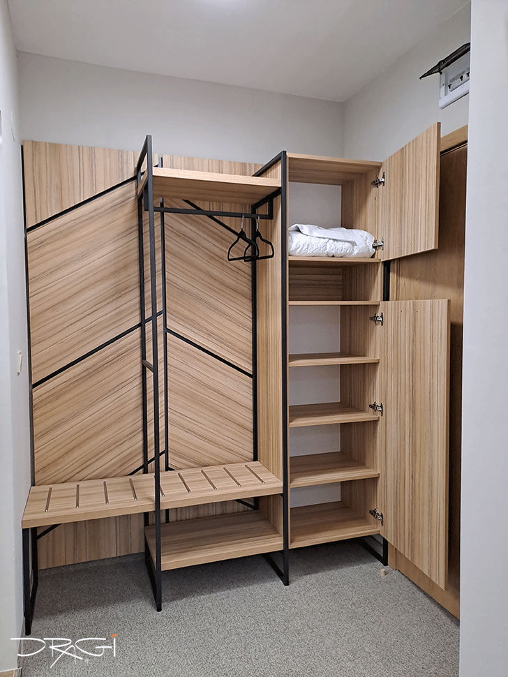 Мебелите са изработени по проект на клиента. Хотелското обзавеждане включва ламперии, нощни шкафчета, гардероби, тоалетки, цветарници и други. Съчетаните материали са ПДЧ и метал.