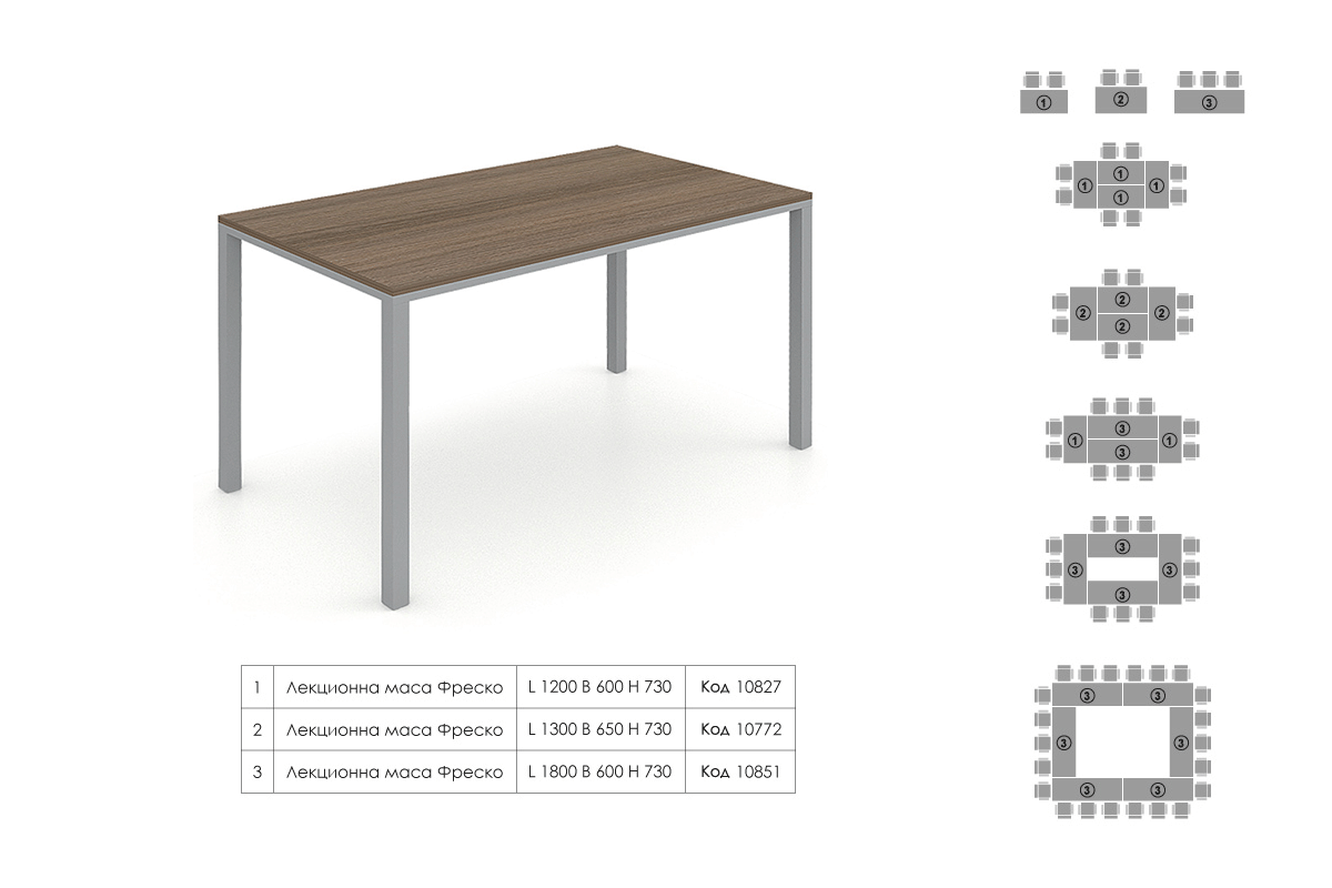 Лекционни маси Фреско са изработени със съвременна линия с много добри пропорции. Дебелината на рамката с плота е равна на тази на краката - 40мм. А кратните на две размери на плота (1200/600мм) позволяват масите да се композират по няколко начина, така че да изпълняват различни предназначения.