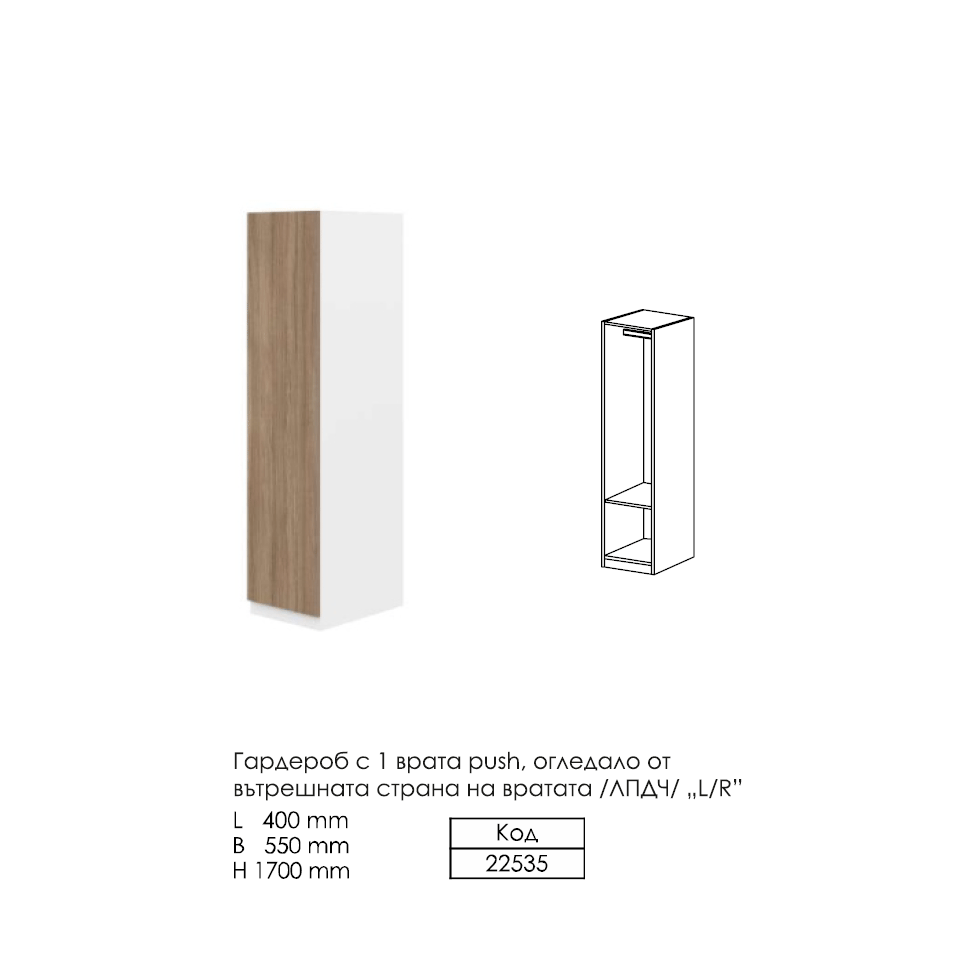 - Код 22535 Гардероб еднокрилен с огледало от вътрешната страна