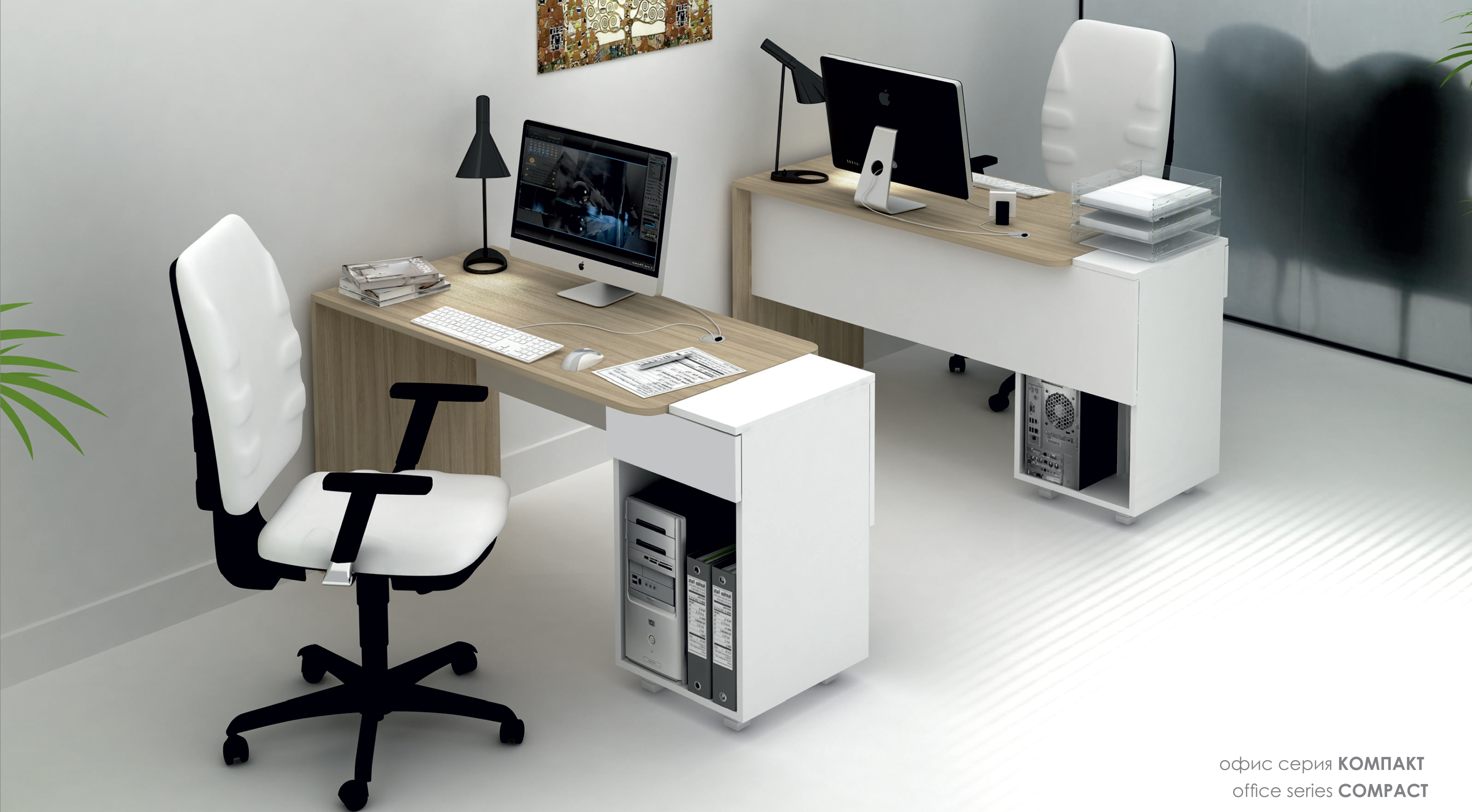 Офис серия КОМПАКТ предлага минимизирано и функционално работно място, било то единично, двойно, тройно или четворно. Въпреки компактните си размери не се губи ергономията и полезната площ на всички необходими аксесоари за един офис.