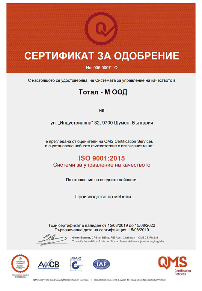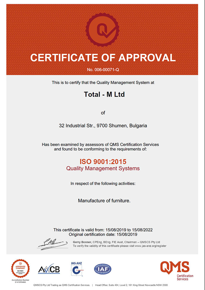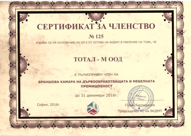 Тотал - М ООД е член на Браншова камара на дървообработващата и мебелна промишленост и има внедрени: