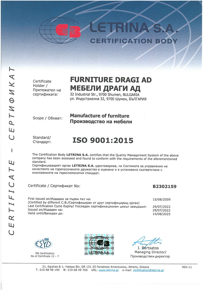 - Система за контрол на качеството по стандарт ISO 9001:2008;