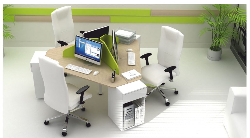 Серия Компакт предлага бюра, комбинирани за 3 или 4 работни места. Служителите са разположени един срещу друг, комуникират по-лесно и ефективно. Всеки разполага с открит шкаф и чекмедже за принадлежности. Всяко работно място е обособено чрез прегради върху работния плот.